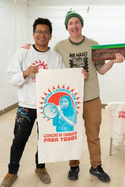 screenprinting 400-plus prints of “Justice for Immigrants and Refugees” at the Voces Assembly. January 2025